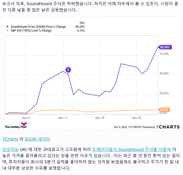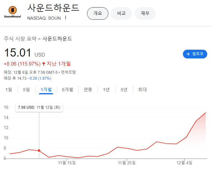 사운드하운드 ai 주가가 11.12 실적발표 기준일로부터 한 달이 채 되지 않아 100% 급등하였다.
