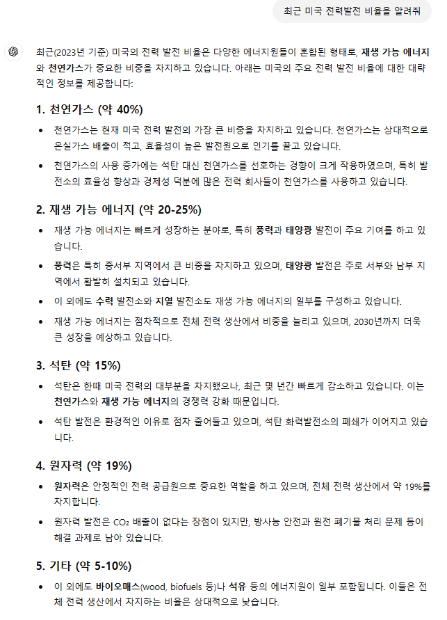 아래는 미국 전력발전 비율에 관한 내용이다.