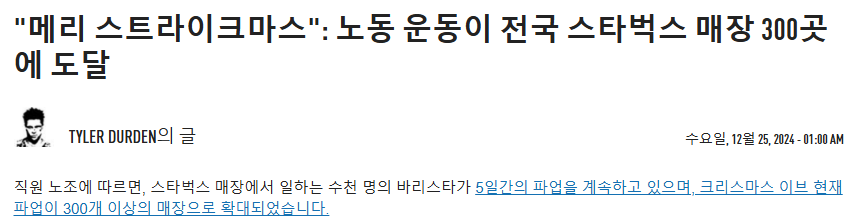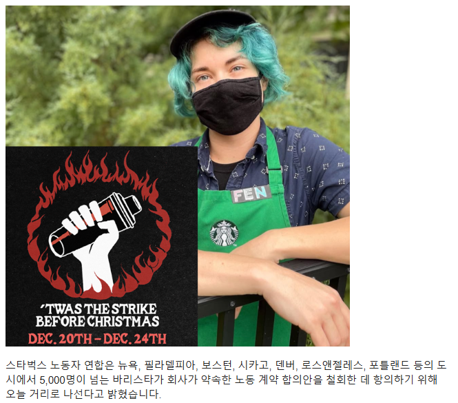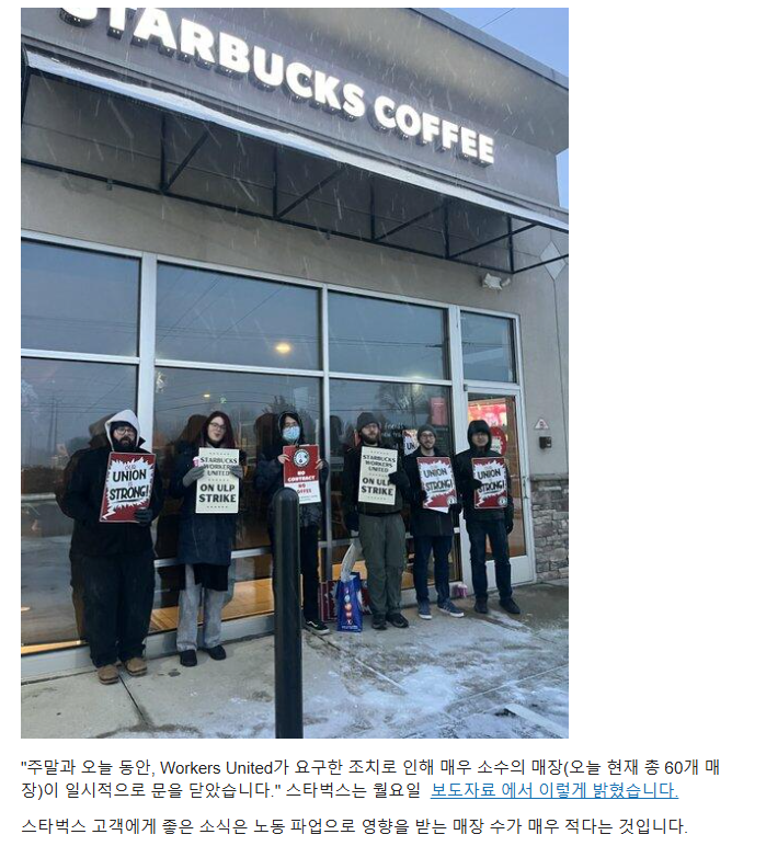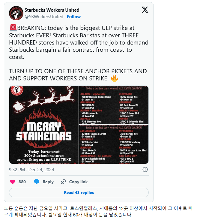 크리스마스 기준 스타벅스 300여 곳이 파업을 하고 있다는 소식!