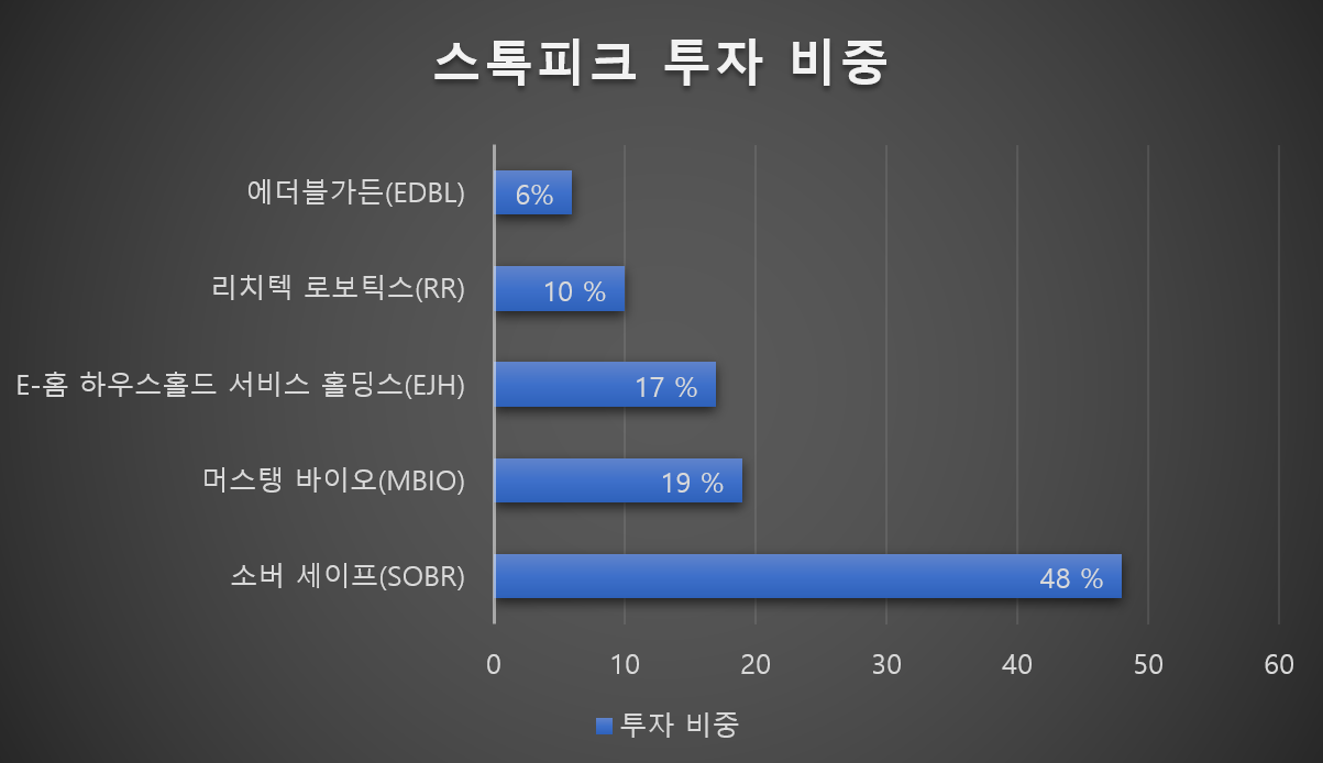 리치텍로보틱스(RR) 일부 익절소버세이프(SOBR) 추가 매수 투자 금액대비로 투자 비중 계산 1.04 리치텍로보틱스(RR) 일부 익절로 인해 투자금액이 약 5400만원으로 증가투자 금액 대비 투자비중리치