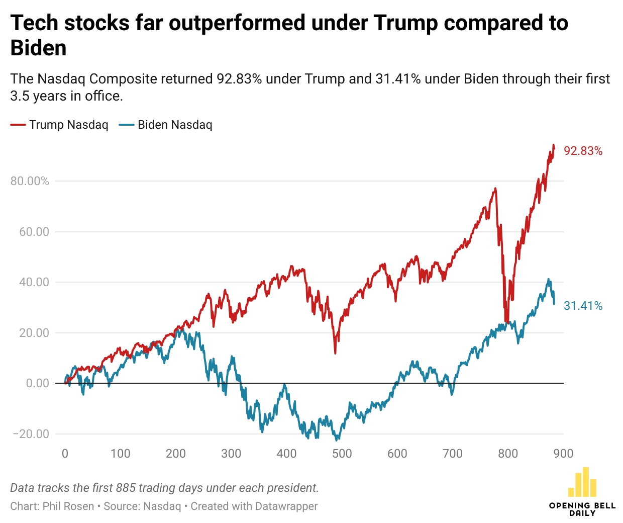 나스닥 종합 지수는 취임 첫 3.5년 동안 트럼프 하에서 92.83%, 바이든 하에서 31.41%의 수익률을 기록했습니다.