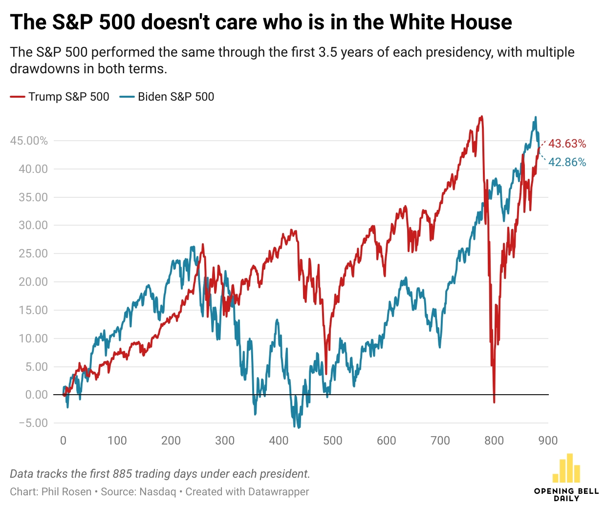 S&P 500은 각 대통령의 첫 3.5년 동안 여러 차례 하락했었지만, 결과적으로 43% 수익률이란 동일한 성과를 거두었습니다.
