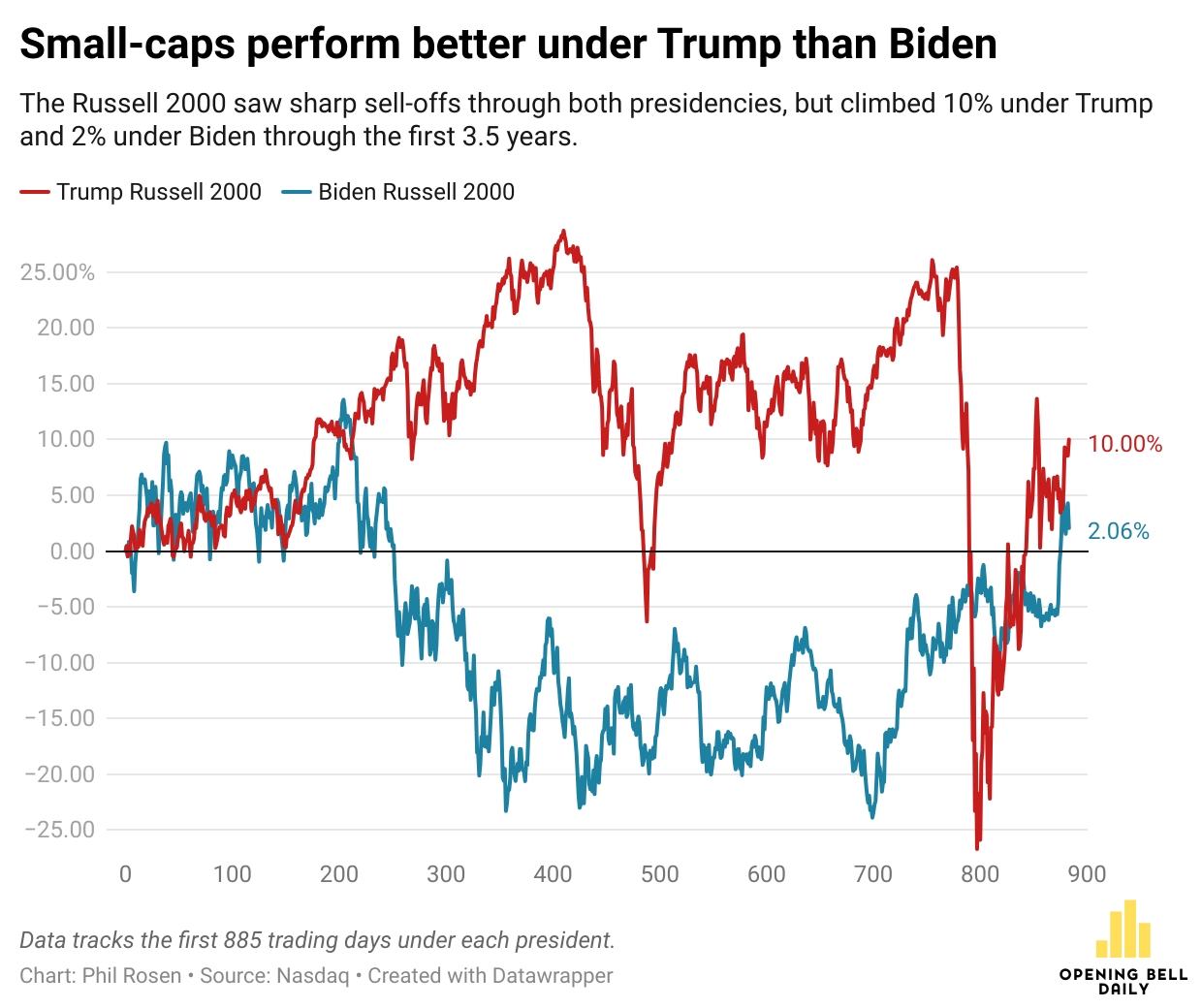 러셀 2000은 두 대통령 집권을 통해 급격한 매도세를 보였지만 처음 3.5년 동안 트럼프 대통령 하에서는 10%, 바이든 하에서는 2% 상승했습니다.