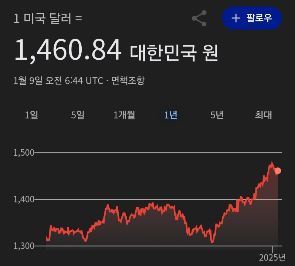 01.09 기준 달러환율은 다음과 같습니다. 트럼프 연설 이후 하락한 상태이지만 아직 굉장히 높습니다.