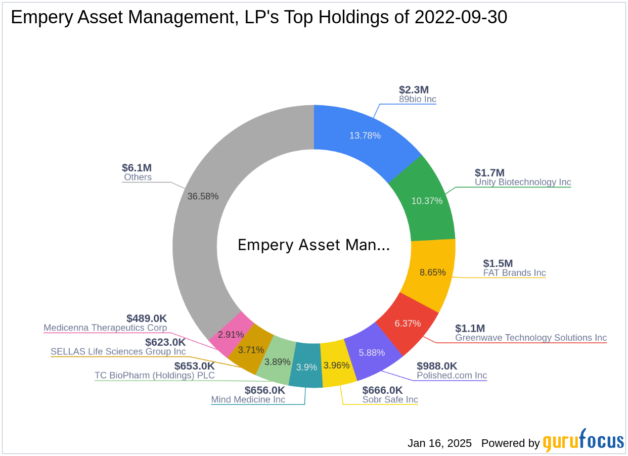 Empery Asset Management의 포트폴리오에는 Unity Biotechnology Inc, Greenwave Technology Solutions Inc, 89bio Inc와 같은 회사의 주요 지분이 포함됩니다. 1,700만 달러의 주식 가치를 가진 이 회사는 전문 지식을 활용하여 유망한 기회를 파악하고 투자합니다.