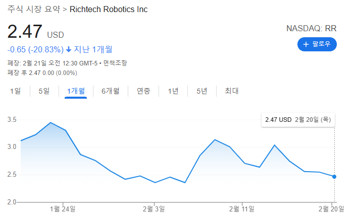 ≽^•⩊•^≼ 1달러 근처에 매수할 수 있는 AI 로봇 산업 미국주식 리치텍 로보틱스(Richtech Robotics)의 티커는 RR이다.https://www.richtechrobotics.com/ Richtech Robotics | Revolutionary Automated Solutions ProviderFor ove