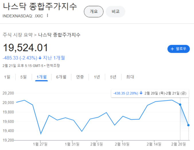 02.25 트루골프(TRUG) 매수 02.28 기준 저번 매매 날(02.21)과 비교했을 때 달러환율 약 0.9% 상승나스닥 지수 약 2.8% 하락 나스닥이 하락하고 있다. 미국주식 하락장의 시작일까? 3
