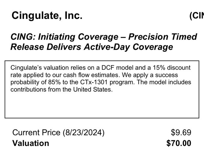 By John Vandermosten, CFA NYSE:CING READ THE FULL CING RESEARCH REPORT We are initiating coverage of Cingulate, Inc. (NYSE:CING) with a target price of $70.00 per share. This value is based on our forecasts for the successful development and commercializat